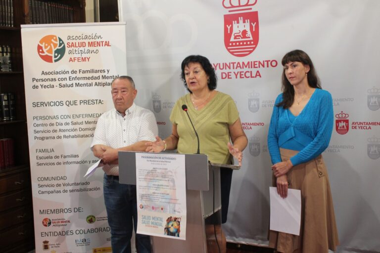 La Concejala de Política Social, Patricia Soriano, el Presidente de AFEMY-Salud Mental Altiplano , Joaquín Marín, y la directora de esta asociación, Inmaculada Albert han presentado las actividades programadas por la Asociación de Salud Mental Altiplano (AFEMY) con motivo de la celebración del Día Mundial de la Salud Mental, el próximo 10 de octubre.
