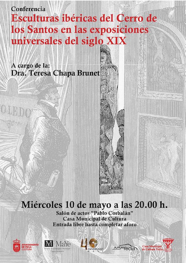 40 aniversario MaYe (1983-2023): Conferencia «Esculturas ibéricas del Cerro de los santos en las exposiciones universales del siglo XIX» a cargo de la Dr.a Teresa Chapa Brunet + Añadir Google Calendar + exportación iCal / Outlook Fecha 10 May 2023 ¡Caducado! Hora 20:00 Localización Salón de Actos Pablo Corbalán C/ España, 37 - 30510 Yecla (Murcia) Organizador Concejalía de Cultura, Casa Muncipal de Cultura y Museo Arqueológico "Cayetano de Mergelina"