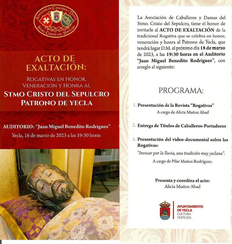 Acto de exaltación: Rogativas en honor, veneración y honra al Stmo. Cristo del Sepulcro, Patrono de Yecla + Añadir Google Calendar + exportación iCal / Outlook Fecha 18 Mar 2023 ¡Caducado! Hora 19:30 Localización Auditorio Municipal "Juan Miguel Benedito" Plaza Mayor, s/n - 30510 Yecla (Murcia) Categoría Actos Auditorio Municipal Organizador Concejalía de Cultura y Festejos