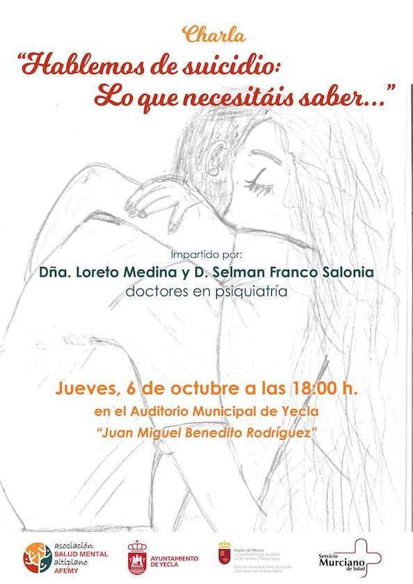Jueves 6 de octubre, a las 18 horas, en el Auditorio Municipal “Juan Miguel Benedito” charla “Hablemos del suicidio:lo que necesitáis saber…” a cargo de Loreto Medina y Selman Franco Salonia, doctores en psiquiatria. Organiza AFEMY con motivo del Día Mundial de la Salud Mental.