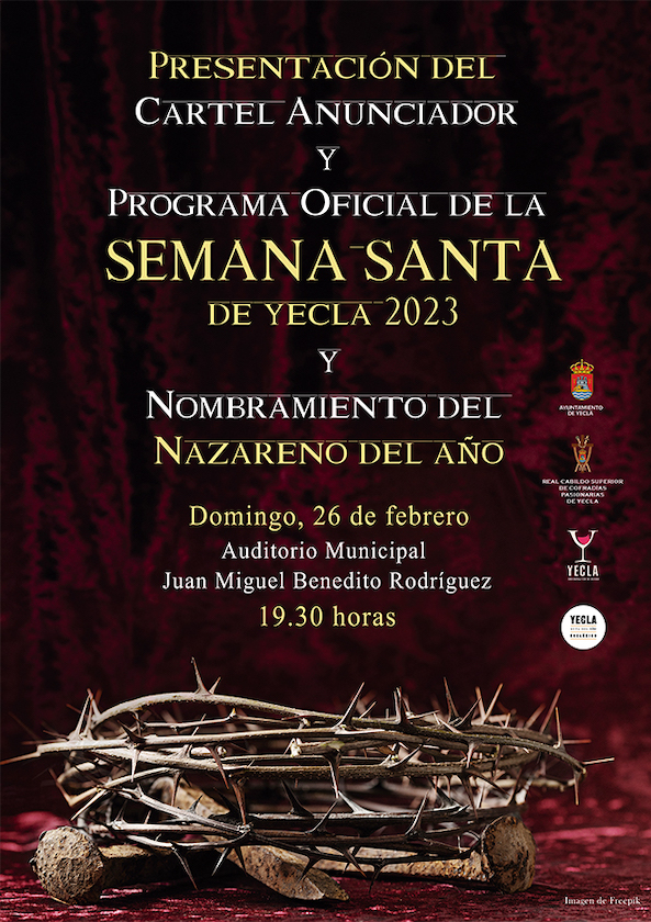 Cuaresma Cultural 2023: Presentación del cartel anunciador y programa oficial de la Semana Santa de Yecla 2023 Además, nombramiento del Nazareno del Año. + Añadir Google Calendar + exportación iCal / Outlook Fecha 26 Feb 2023 ¡Caducado! Hora 19:30 Localización Auditorio Municipal "Juan Miguel Benedito" Plaza Mayor, s/n - 30510 Yecla (Murcia) Categoría Actos Auditorio Municipal Organizador Ayuntamiento de Yecla y Real Cabildo de Cofradías