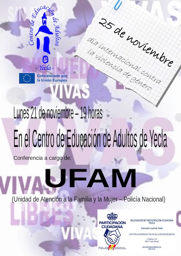Día Internacional contra la Violencia de Género: Conferencia a cargo de UFAM + Añadir Google Calendar + exportación iCal / Outlook Fecha 21 Nov 2022 ¡Caducado! Hora 19:00 Localización Centro de Educación de Adultos Calle Párroco Joaquín Martínez Guillamón, 2 Organizador UFAM, Unidad de Atención a la Familia y la Mujer - Policía Nacional
