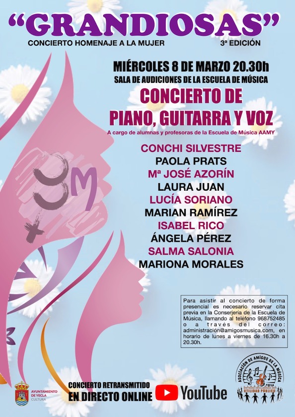 La Asociación de Amigos de la Música de Yecla informa, que el próximo miércoles 8 de marzo, coincidiendo con la conmemoración del Día Internacional de la Mujer, se va a realizar, por tercer año consecutivo, un concierto a cargo de alumnas y profesoras de la Escuela de Música, coordinado por la profesora de canto Conchi Silvestre Díaz, y con el nombre genérico de “Grandiosas”.