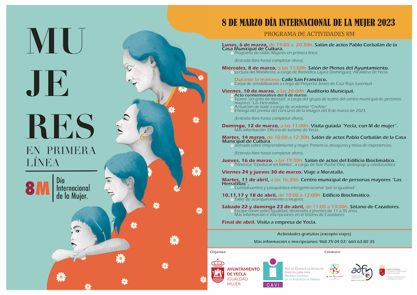 A excepción del viaje, todas las actividades de estas jornadas de “Mujeres en Primera Línea” serán gratuitas hasta completar aforo, pudiéndose obtener más información e inscripciones en los teléfonos 968 75 04 07 y 660 63 80 35, así como en el siguiente enlace https://www.yecla.es/actividades-del-8-de-marzo/