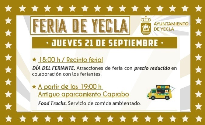FERIA DE YECLA 2023. ACTOS JUEVES 21 DE SEPTIEMBRE 2023 + Añadir Google Calendar + exportación iCal / Outlook Fecha 21 Sep 2023 ¡Caducado! Hora 18:00 Categoría Real de la Feria