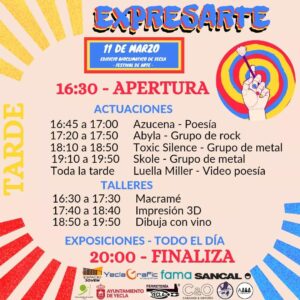 Expresarte incluirá actuaciones de grupos y solistas musicales como Abyla o Toxic Silence, así como también de poesía y danza. De igual manera, habrá exposiciones de pinturas, esculturas y cuadros, proyecciones de cortos y de diferentes proyectos, así como distintos talleres, como de Impresión 3D o macramé.