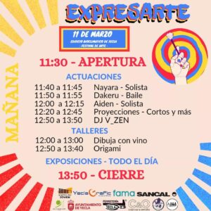 El festival “Expresarte” estará abierto a todo tipo de público de manera totalmente gratuita y tendrá lugar este próximo sábado 11 de marzo en horario de 11.30 a 13.50 horas y de 16.30 a 20.00 horas en el Edificio Bioclimático de Yecla.