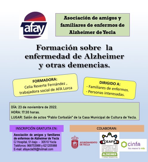 Formación sobre la enfermedad del Alzheimer y otras demencias + Añadir Google Calendar + exportación iCal / Outlook Fecha 23 Nov 2022 ¡Caducado! Hora 17:30 Localización Salón de Actos Pablo Corbalán C/ España, 37 - 30510 Yecla (Murcia) Categoría Actos salón Pablo Corbalán Organizador Ayuntamiento de Yecla y AFAY