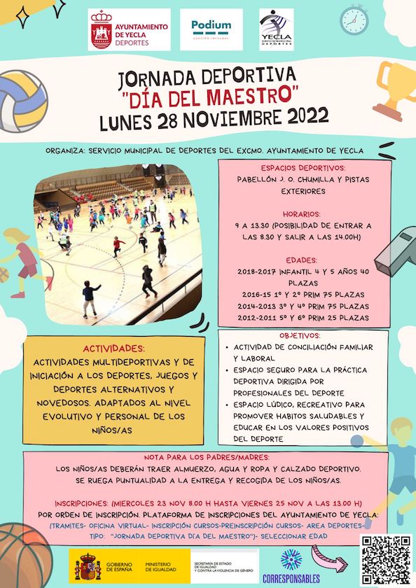 Jornada deportiva «Día del Maestro» + Añadir Google Calendar + exportación iCal / Outlook Fecha 28 Nov 2022 ¡Caducado! Hora 9:00 Localización Pabellón polideportivo José Ortega Chumilla Categoría Actos Pabellón José Ortega Chumilla