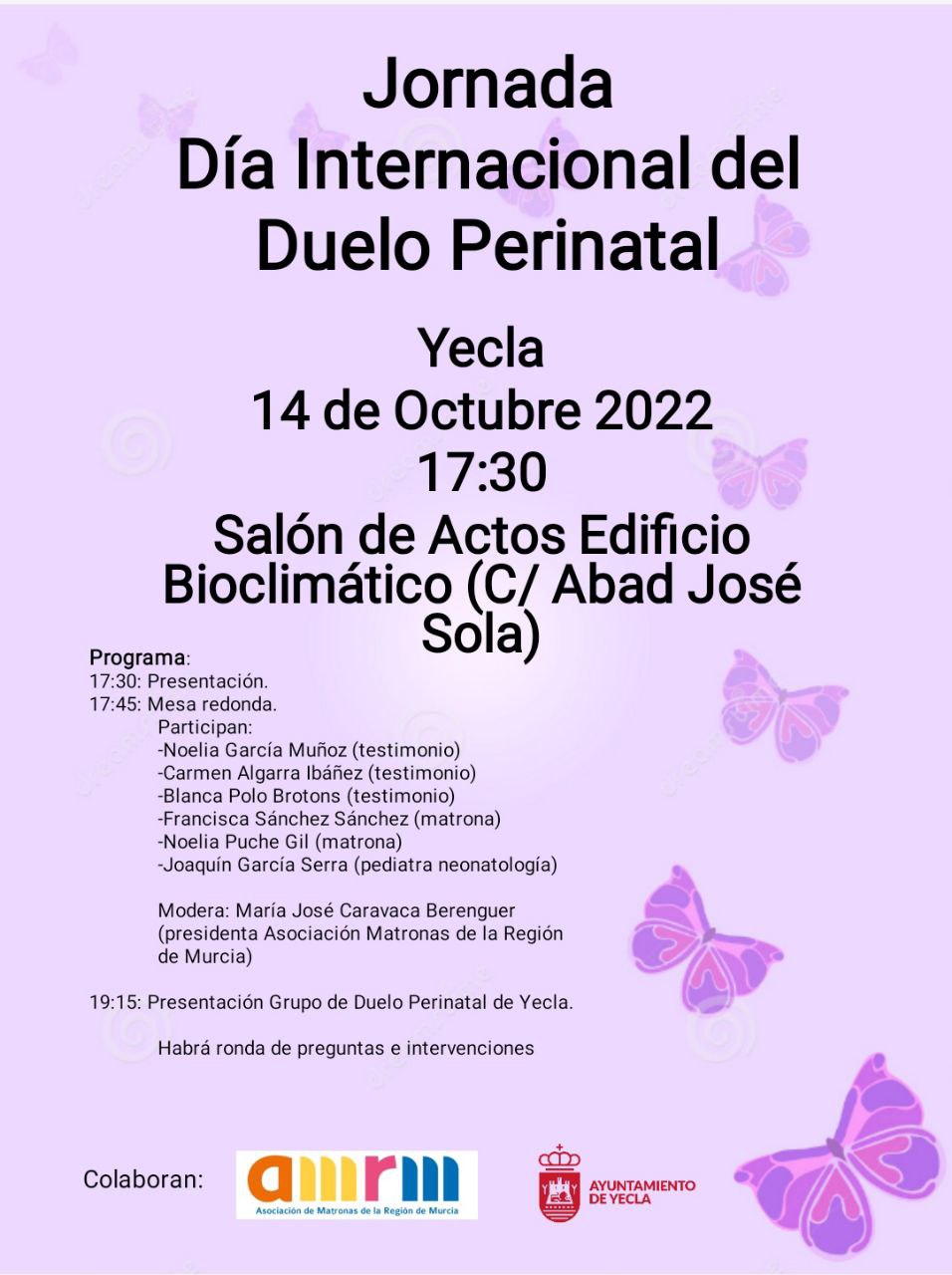 Jornada Día Internacional del Duelo Perinatal + Añadir Google Calendar + exportación iCal / Outlook Fecha 14 Oct 2022 ¡Caducado! Hora 17:30 Localización Edificio Bioclimático Calle Abad José Sola, s/n Categoría Actos Edificio Bioclimático Organizador Ayuntamiento de Yecla. Colabora: Asociación de Matronas de la Región de Murcia