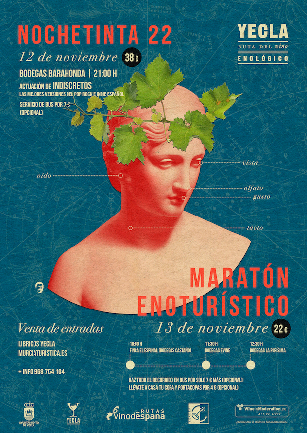 La mañana del domingo, 13 de noviembre, a partir de las 10:00 h. tendremos el Maratón Enoturístico, recorrido vinícola gastronómico por las bodegas y establecimientos asociados a la Ruta del Vino de Yecla para seguir catando vinos, aceites y platos típicos de nuestra ciudad.