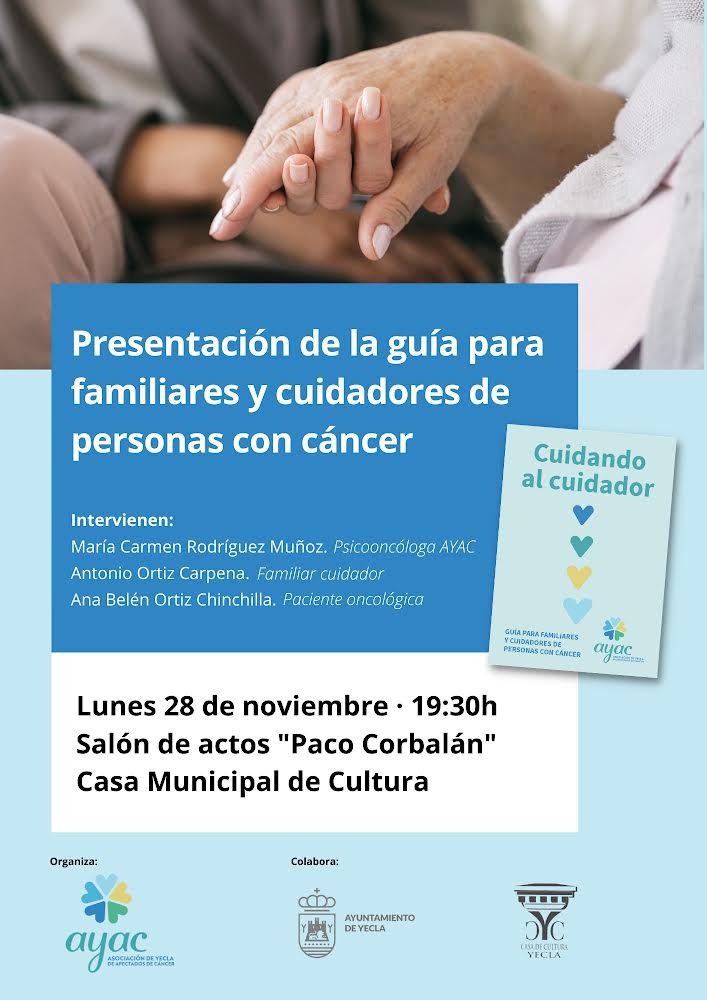 Presentación de la guía para familiares y cuidadores de personas con cáncer + Añadir Google Calendar + exportación iCal / Outlook Fecha 28 Nov 2022 ¡Caducado! Hora 19:30 Localización Salón de Actos Pablo Corbalán C/ España, 37 - 30510 Yecla (Murcia) Categoría Actos salón Pablo Corbalán Organizador AYAC Yecla y Ayuntamiento de Yecla