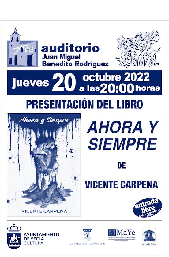 El concejal de Cultura, Jesús Verdú ha anunciado que mañana jueves 20 de octubre, a las 20:00 horas, en el Auditorio Municipal ”Juan Miguel Benedito” se celebrará el acto de presentación del libro “Ahora y siempre”, una recopilación de trabajos literarios, especialmente poesía, del poeta yeclano Vicente Carpena.