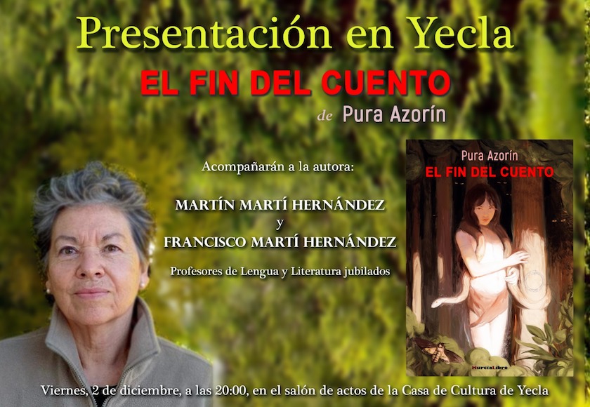 Presentación del libro: «El fin del cuento» de Pura Azorín + Añadir Google Calendar + exportación iCal / Outlook Fecha 02 Dic 2022 ¡Caducado! Hora 20:00 Localización Salón de Actos Pablo Corbalán C/ España, 37 - 30510 Yecla (Murcia) Categoría Actos salón Pablo Corbalán Organizador Casa Municipal de Cultura