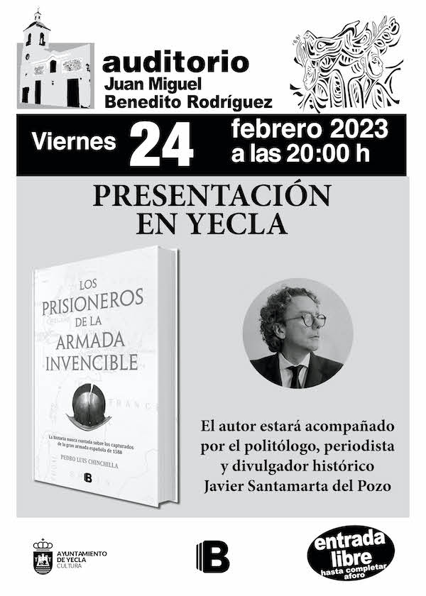 Presentación del libro «Los prisioneros de la Armada Invencible» de Pedro Luis Chinchilla + Añadir Google Calendar + exportación iCal / Outlook Fecha 24 Feb 2023 ¡Caducado! Hora 20:00 Localización Auditorio Municipal "Juan Miguel Benedito" Plaza Mayor, s/n - 30510 Yecla (Murcia) Organizador Concejalía de Cultura