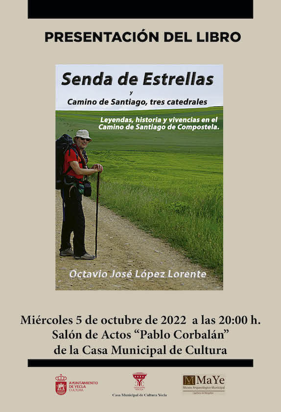Presentación del libro: «Senda de estrellas y Camino de Santiago, tres catedrales» de Octavio José López Lorente + Añadir Google Calendar + exportación iCal / Outlook Fecha 05 Oct 2022 ¡Caducado! Hora 20:00 - 20:00 Localización Salón de Actos Pablo Corbalán C/ España, 37 - 30510 Yecla (Murcia) Categoría Actos salón Pablo Corbalán Organizador Concejalía de Cultura, Casa Muncipal de Cultura y Museo Arqueológico "Cayetano de Mergelina"