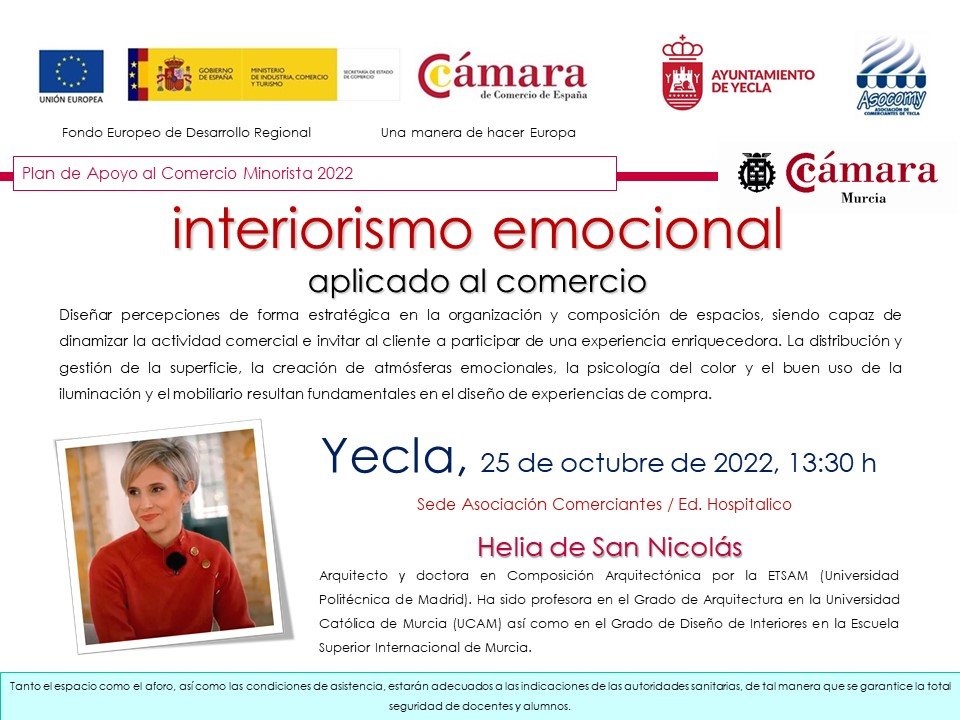 Finalmente, los talleres se cerrarán el 25 de octubre con el curso “Interiorismo emocional aplicado al comercio”. Su programa tratará aspectos como la creación de atmósferas emocionales para mejorar las experiencias en las compras. Lo impartirá Helia de San Nicolás, arquitecto y doctora en Composición Arquitectónica por la ETSAM (Universidad Politécnica de Madrid).