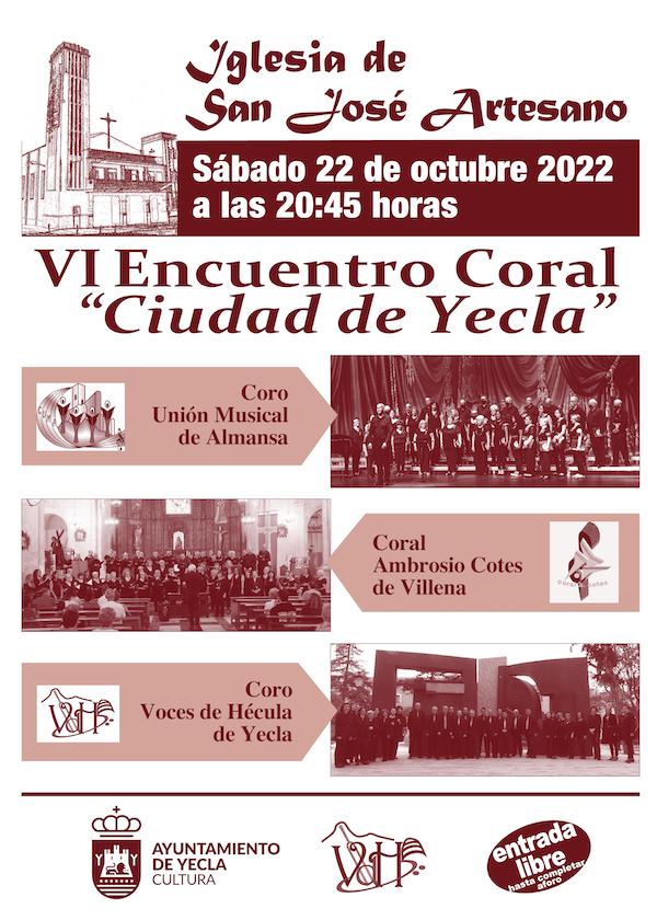 La concejalía de Cultura ha presentado la VI edición del Encuentro Coral ‘Ciudad de Yecla’ que tendrá lugar el sábado 22 de octubre a las 20:45 horas, en esta ocasión en la Iglesia de San José Artesano, por las obras de la Iglesia de San Francisco. Participan el Coro Unión Musical de Almansa, Coral Ambrosio Cotes de Villena y Voces de Hécula de Yecla
