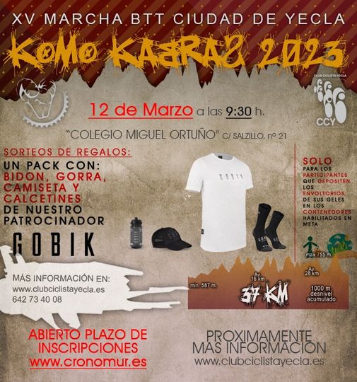 XV Marcha BTT Ciudad de Yecla «Komo Kabras» 2023 + Añadir Google Calendar + exportación iCal / Outlook Fecha 12 Mar 2023 ¡Caducado! Hora 9:30 Localización Colegio Miguel Ortuño Calle Salzillo 21 Organizador Club Cicista Yecla