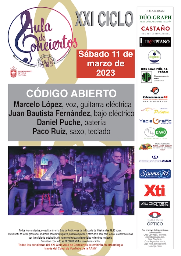 Este tercer concierto del Ciclo se celebrará en la Sala de Audiciones de la Escuela de Música a las 19:30 h con aforo limitado para 90 personas, y previa reserva de sillas contactando con la Escuela de Música. Dicho recital será interpretado por el grupo “Código Abierto” formación integrada por los músicos yeclanos: Marcelo López (voz, guitarra eléctrica), Juan Bautista Fernández (bajo eléctrico), Daniel Puche (batería) y Paco Ruiz (teclado y saxo).