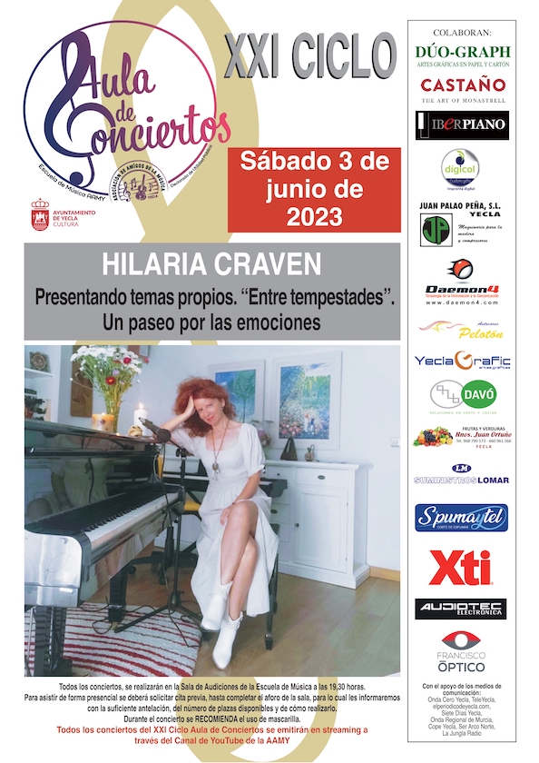 Este octavo concierto del Ciclo se celebrará en la Sala de Audiciones de la Escuela de Música a las 19:30 h. con  aforo limitado para 90 personas, y previa reserva de sillas contactando con la Escuela de Música. Consistirá en un concierto del nuevo proyecto musical de Hilaria Craven, formado por los músicos: Jesús Puche, batería; Juan Bautista Fernández, bajo eléctrico; Manu Ramos, guitarra eléctrica; Laura Ortega, violín; Francisco José Zárate, trombón; Francisco Díaz, trompeta, Paco Ruiz, saxofón y Pilar Chinchilla “Hilaria Craven” piano y voz, y con la inestimable colaboración en la parte técnica, bastante compleja en esta ocasión, del profesor de la Escuela de Música Rubén Cecilia.