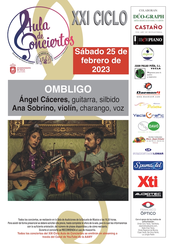 Este segundo concierto del Ciclo se celebrará en la Sala de Audiciones de la Escuela de Música a las 19:30 h. con aforo limitado para 90 personas, y previa reserva de sillas contactando con la Escuela de Música. En el mismo podremos disfrutar del concierto de Ombligo, formación madrileña integrada por: Ángel Cáceres, guitarra y silbido y Ana Sobrino, violín, charango y voz.