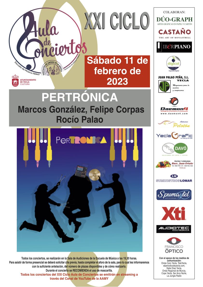 Este primer concierto del Ciclo se celebrará en la Sala de Audiciones de la Escuela de Música a las 19:30 h. con aforo limitado para 90 personas, y previa reserva de sillas contactando con la Escuela de Música. En el mismo podremos disfrutar del proyecto Pertrónica, percusión y electrónica, interpretado por Marcos González, Felipe Corpas y la yeclana Rocío Palao.