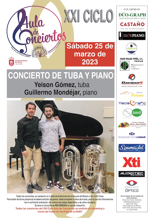 Este cuarto concierto del Ciclo se celebrará en la Sala de Audiciones de la Escuela de Música a las 19:30h. con aforo limitado para 90 personas, y previa reserva de sillas contactando con la Escuela de Música. El mismo consistirá en un concierto de tuba y piano, a cargo de Yeison Gómez, tuba, y Guillermo Mondéjar, piano.