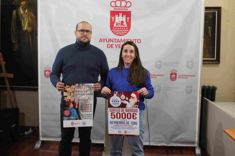La concejala de Comercio, Sara Ortuño y el Presidente de la Asociación de Comerciantes de Yecla (Asocomy) Adrián Soriano, han presentado una nueva edición del sorteo Extraordinario de Navidad de Asocomy que estará dotado con 5.000 euros distribuidos en 50 premios de 100 euros. Por cada compra en las tiendas asociadas de Asocomy el cliente recibirá una papeleta con la que se podrá optar a uno de los 50 premios. El sorteo se realizará el 14 de enero de 2023. Los premios consistirán en vales de 100 euros para gastar en los 166 comercios asociados. Las papeletas caducan el 11 de marzo de 2023