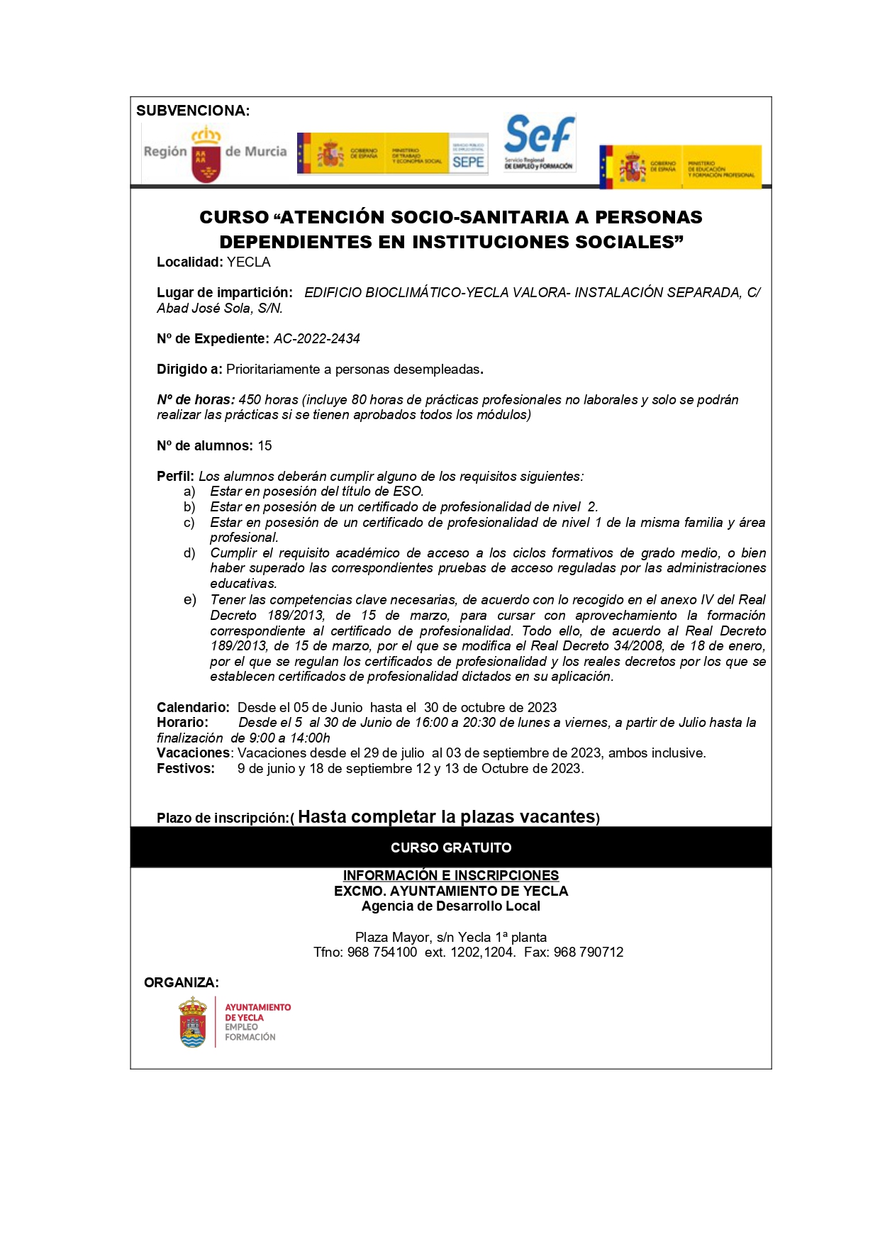 Lugar de impartición: EDIFICIO BIOCLIMÁTICO-YECLA VALORA- INSTALACIÓN SEPARADA, C/ Abad José Sola, S/N.