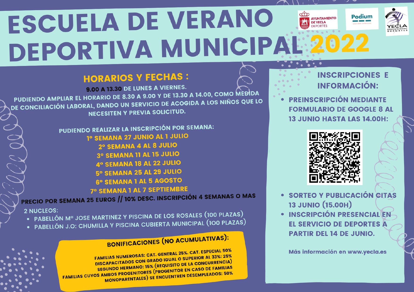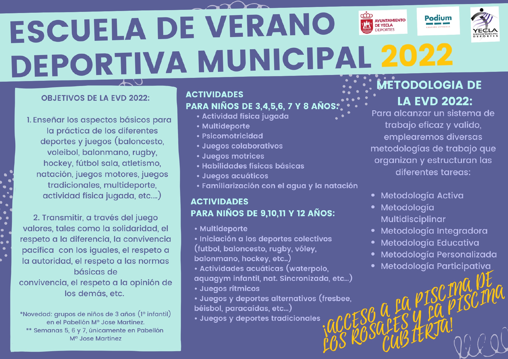 La Escuela Deportiva Municipal de Verano de Yecla surge con dos objetivos principales, por una lado como un recurso para la conciliación familiar y laboral durante la época de vacaciones escolares y segundo con el fin de cumplir con las recomendaciones de actividad física y salud diarias para menores de edad de la OMS, crear hábitos de vida saludable, promover el deporte y crear una adherencia al mismo, mejorar la calidad de vida de los niños/as y de promover aspectos integradores y sociales siguiendo las pautas de