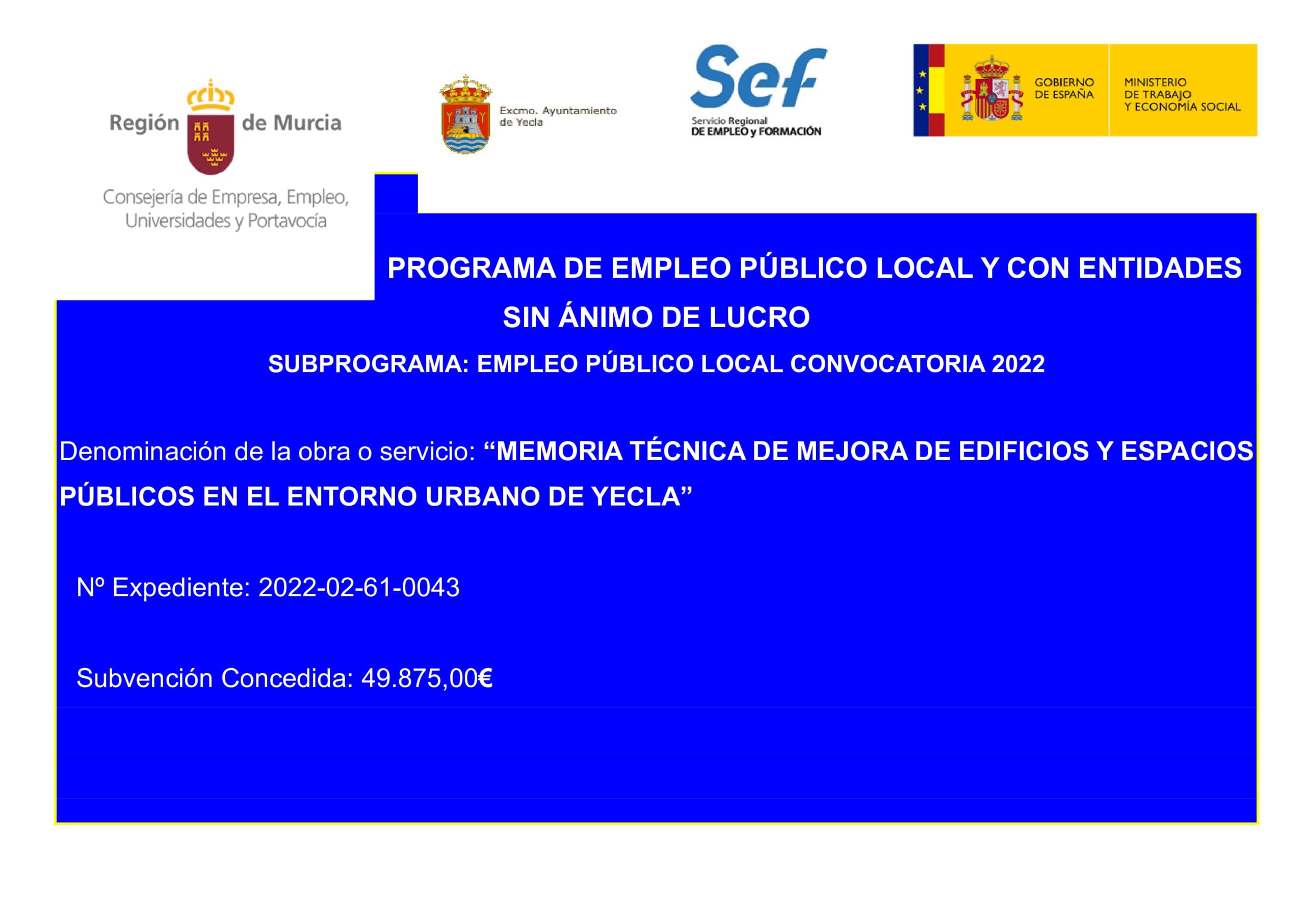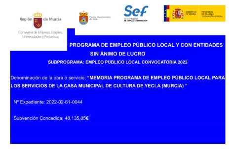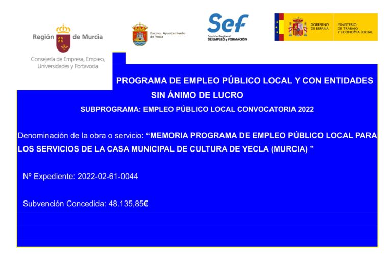 Los distintos programas de empleo público están orientados a subvencionar la contratación de trabajadores desempleados para la ejecución de obras y servicios de interés general y social en el ámbito de la colaboración de la Comunidad Autónoma de la Región de Murcia con las Corporaciones Locales y con entidades sin ánimo de lucro.