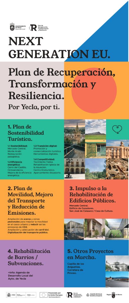 El Ayuntamiento de Yecla, dentro del Plan de Recuperación, Transformación y Resiliencia (PRTR), pone en marcha un plan con diversos proyectos para potenciar y transformar la ciudad de Yecla, por y para sus vecinos, así como para los visitantes que vengan a conocer y disfrutar nuestra ciudad.