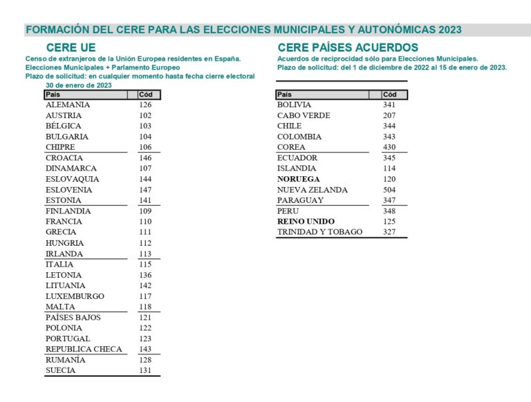 Los residentes en España nacionales de Bolivia, Cabo Verde, Chile, Colombia, Corea, Ecuador, Islandia, Noruega, Nueva Zelanda, Paraguay, Perú, Reino Unido y Trinidad y Tobago, podrán solicitar la inscripción en el censo electoral para las elecciones municipales del 28 de mayo de 2023.