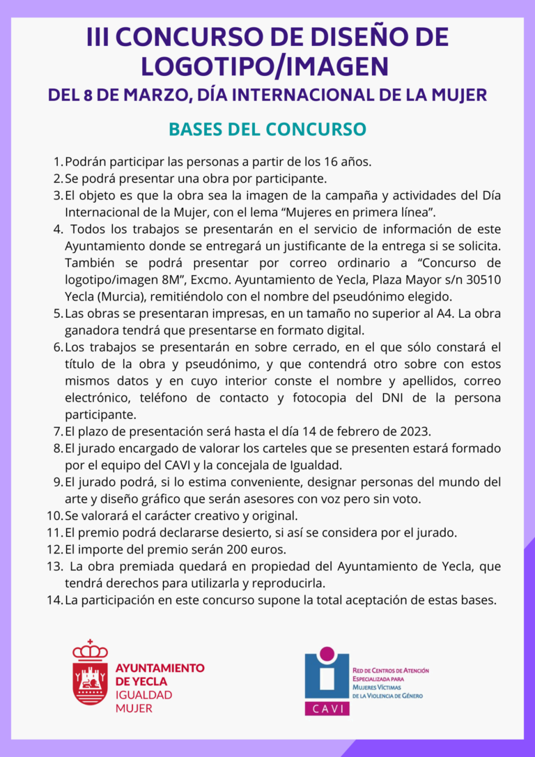 - Todos los trabajos se presentarán en el Servicio de Información de este Ayuntamiento donde se entregará un justificante de la entrega si se solicita. También se podrán presentar por correo ordinario a “Concurso de logotipo/imagen 8M”, Excmo. Ayuntamiento de Yecla, Plaza Mayor s/n 30510 Yecla (Murcia), remitiéndolo con el nombre del pseudónimo elegido.