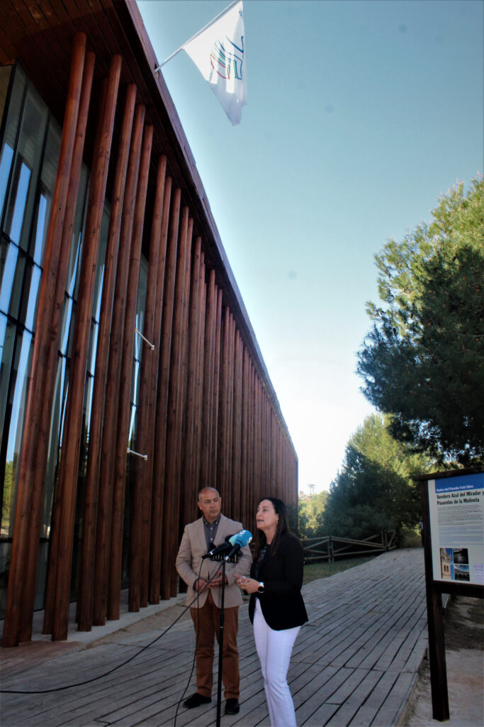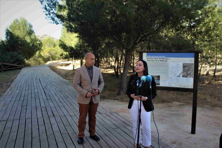 La bandera Sendero Azul ya ondea en el entorno de ‘Pasarelas del Yecla Valora’, así lo han podido comprobar la alcaldesa de Yecla, Remedios Lajara y el concejal de Turismo, Jesús Verdú que han presentado ante los medios de comunicación la ubicación del distintivo medioambiental y la señalética, compuesta por nueve paneles informativos, que ha comenzado a instalarse en las inmediaciones de la ladera sur del Cerro del Castillo, concretamente en el entorno de la Molineta y sus diferentes accesos. Acción encaminada a sumar un nuevo recurso turístico al municipio que favorezca en este sentido la interpretación ambiental, el turismo de naturaleza, en definitiva un añadido a los valores paisajísticos de la ciudad de Yecla.