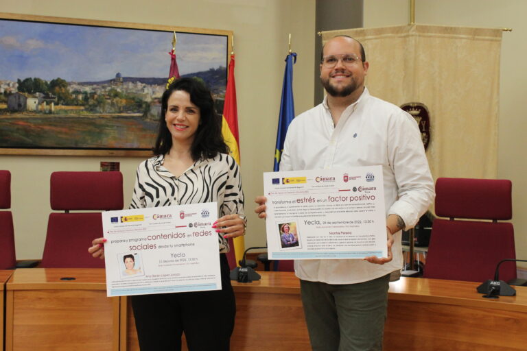 La concejala de Comercio, Inmaculada Lorenzo, ha presentado los tres nuevos talleres gratuitos que la Cámara de Comercio imparte con la colaboración del Ayuntamiento de Yecla y ASOCOMY. La concejala agradeció al presidente de ASOCOMY, Adrián Soriano, por la cesión de las instalaciones de la asociación para estos cursos y así mismo, animó a todos los comercios a que participen en los mismos, independientemente de si pertenecen o no a la asociación. El presidente de ASOCOMY matizó que estos nuevos talleres son una gran oportunidad para la especialización de todos los comerciantes de nuestra ciudad.