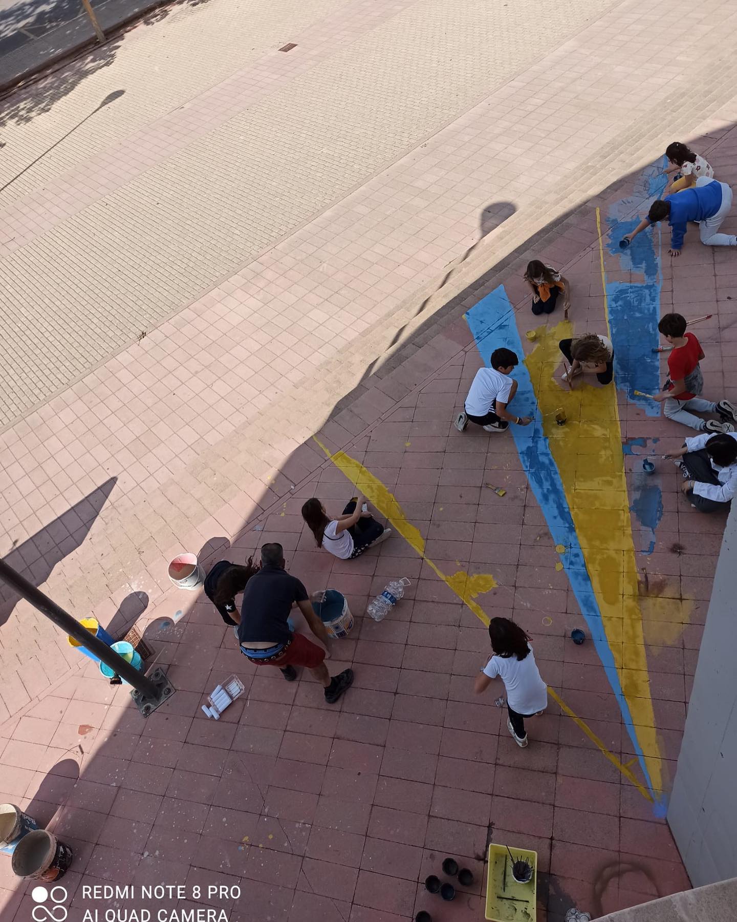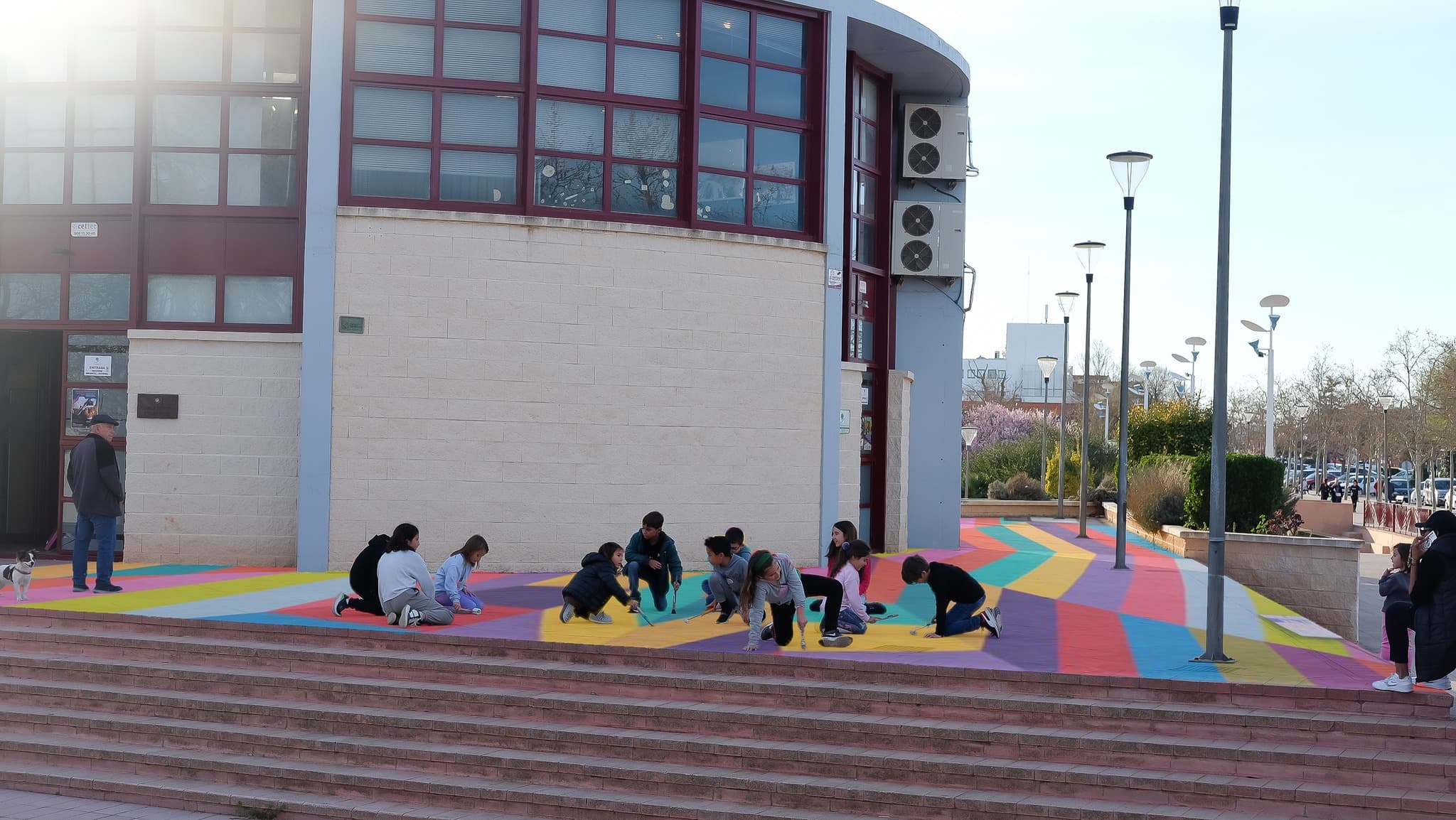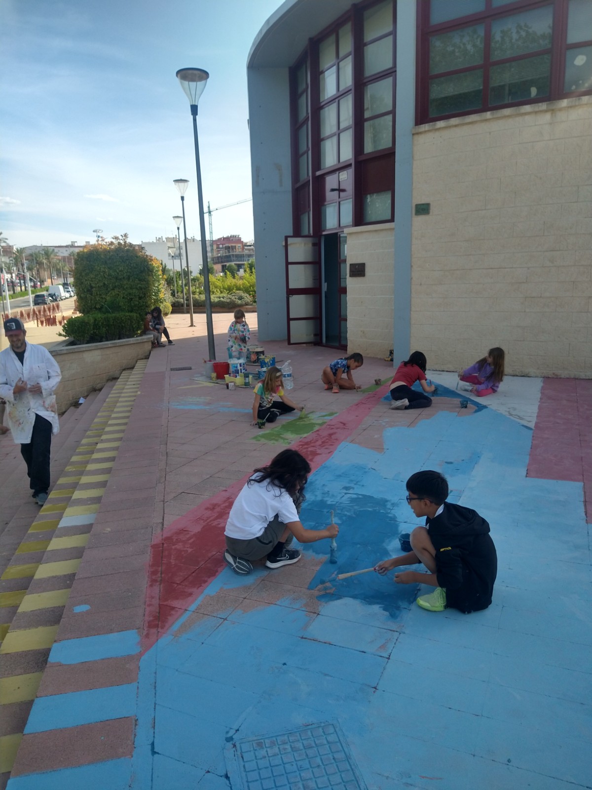 Los alumnos más jóvenes de la Escuela Municipal de Bellas Artes se han puesto manos a la obra para realizar una intervención en el espacio urbano. Con brochas, rodillos, pigmentos y arcilla están convirtiendo el espacio exterior de la escuela en una gigantesca y colorida obra.