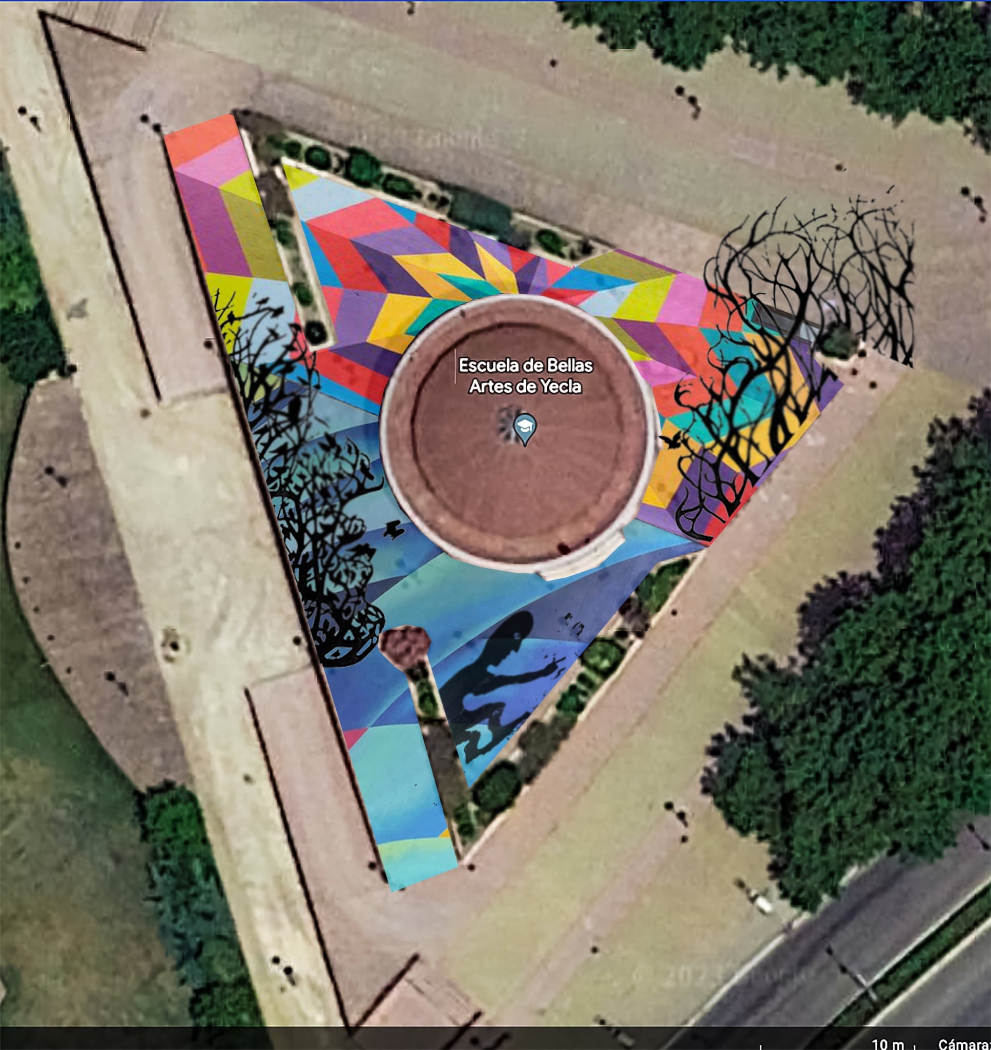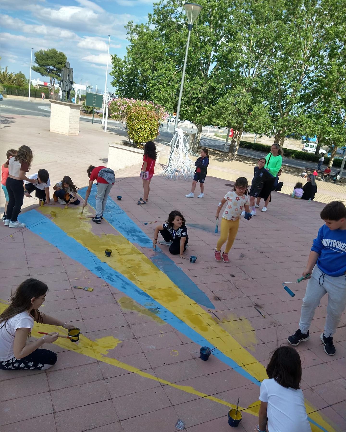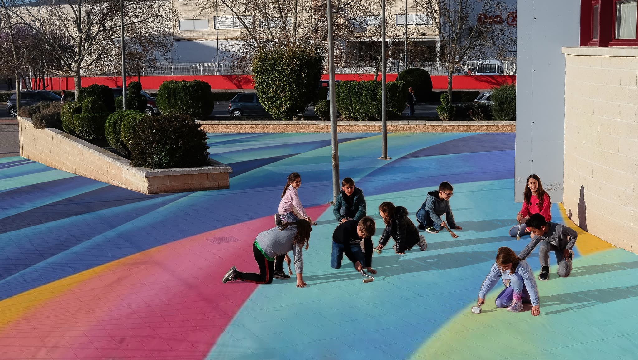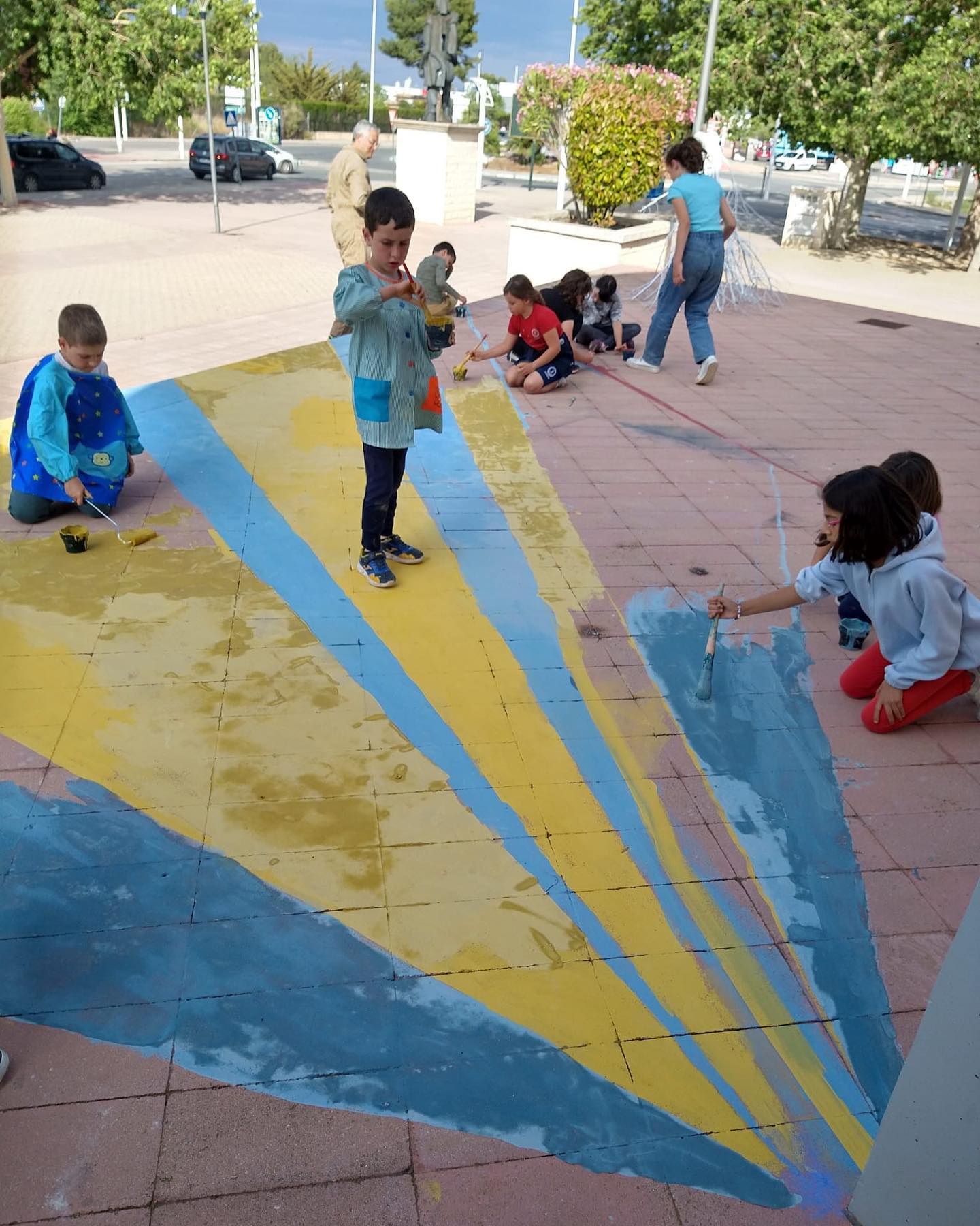 Los alumnos más jóvenes de la Escuela Municipal de Bellas Artes se han puesto manos a la obra para realizar una intervención en el espacio urbano. Con brochas, rodillos, pigmentos y arcilla están convirtiendo el espacio exterior de la escuela en una gigantesca y colorida obra.