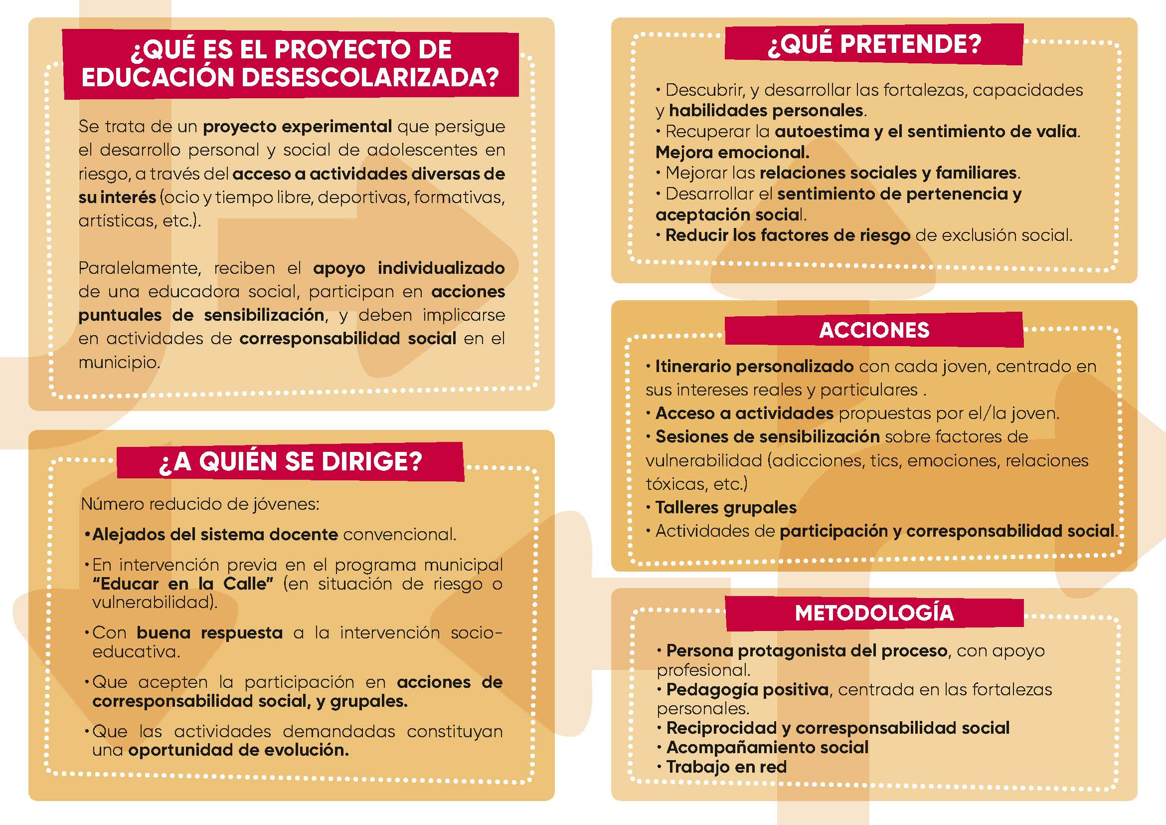 La propuesta está basada en la metodología de pedagogía alternativa «desescolarizada» o «desinstitucionalizada». Se busca proporcionar apoyo profesional individualizado, y recuperar el sentimiento de valía mediante accciones de formación y experiencias vitales centradas en los intereses reales y particulares de cada joven. En contrapartida, se implicarán en acciones de corresponsabilidad social que les permitan identificarse como miembros útiles y valorados de la sociedad.