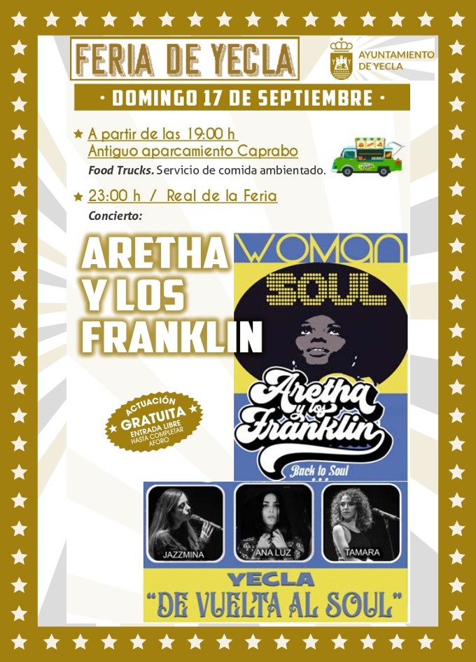 23.00 H. – CONCIERTO DE ARETHA Y LOS FRANKLIN – RECINTO REAL DE LA FERIA Aretha y los Franklin es un espectacular grupo que homenajea a los grandes iconos del soul: Aretha Franklin, Tina Turner, Ray Charles o Amy Winehouse, entre otros, además de interpretar temas propios. Podremos disfrutar de su actuación, con entrada libre, […]