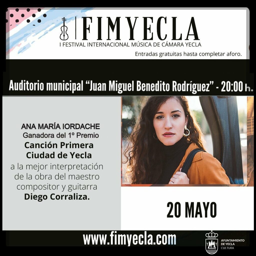 Mañana viernes 20 de mayo, prosigue la programación del I Festival Internacional de Música de Cámara de Yecla organizado por la Concejalía de Cultura. A las 20 horas, en el Auditorio Municipal “Juan Miguel Bendito” tendremos el concierto de guitarra de Ana María Iordache que estrenara la obra “Canción Primera” del compositor y guitarrista yeclano, […]