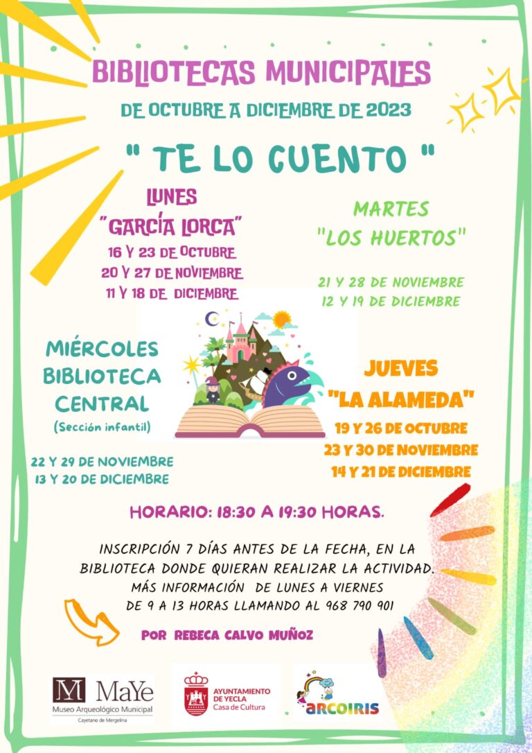 Inscripción: 7 días antes de la fecha, en la biblioteca donde quieran realizar la actividad, más información llamando al 968 79 09 01 (de lunes a viernes de 9:00 a 13:00 horas).