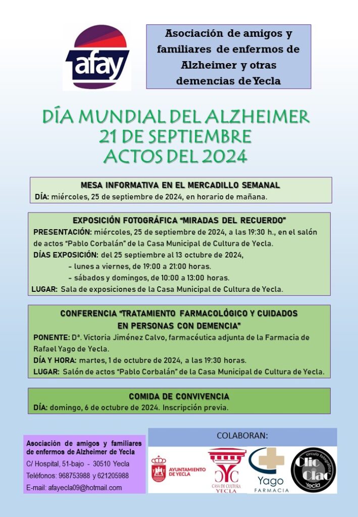 El psicólogo de AFAY, Salvador Hernández, ha recordado la agenda de actividades de la asociación respecto a este Día Mundial del Alzheimer. Así, mañana miércoles 25 de septiembre se realiza una mesa informativa en el Mercadillo Semanal con el objetivo de “informar y sensibilizar a la población de lo que es la enfermedad de Alzheimer, de la repercusión familiar que conlleva, así como de la labor y actividades que se realizan desde la asociación”.