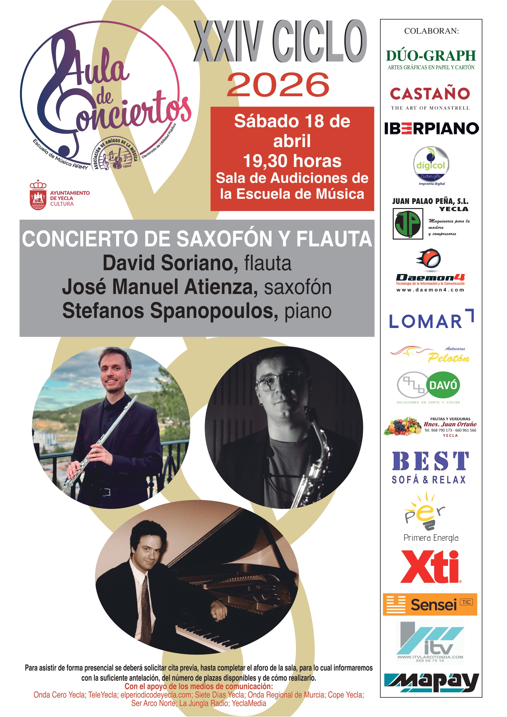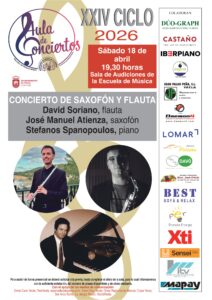 Aula de Conciertos: Saxofón y Flauta XXIV CICLO 2026 – SÁBADO 18 DE ABRIL – 19H30 Sala de Audiciones de la Escuela de Música . + Añadir Google Calendar + exportación iCal / Outlook Fecha 18 Abr 2026 Hora 19:30 Localización Escuela de Música Calle España, 12 Categoría Actos Escuela de Música