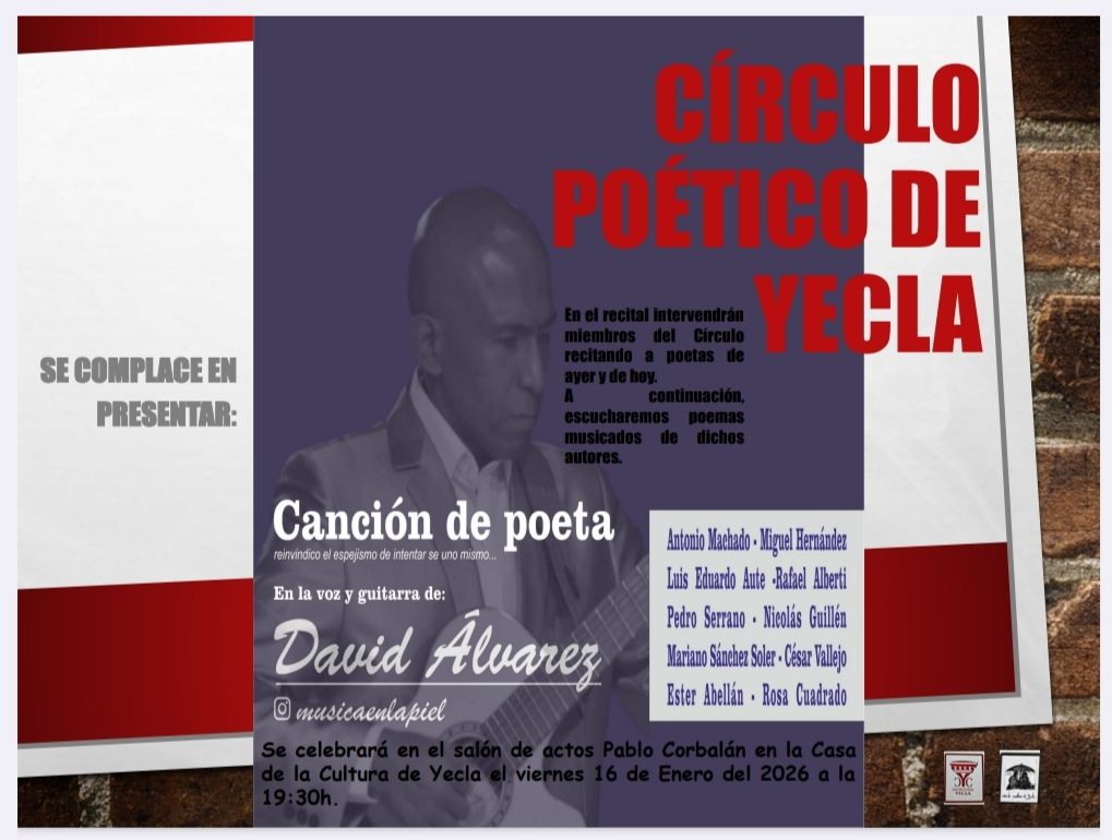 Círculo Poético de Yecla : Canción de poeta Salón de Actos Pablo Corbalán en Casa de Cultura Viernes 16 a las 19h30 + Añadir Google Calendar + exportación iCal / Outlook Fecha 16 Ene 2026 ¡Caducado! Hora 19:30 Localización Salón de Actos Pablo Corbalán C/ España, 37 - 30510 Yecla (Murcia) Categoría Actos Casa Municipal de Cultura
