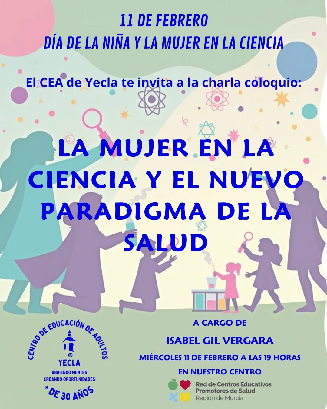 Charla: «La Mujer en la ciencia, el nuevo paradigma en la salud» Miércoles 11 de febrero, 19:00h – IES Felipe VI – CEA Yecla. Centro de Educación de Adultos + Añadir Google Calendar + exportación iCal / Outlook Fecha 11 Feb 2026 Hora 19:00 - 19:00 Localización Escuela de Música Calle España, 12 Categoría Actos Escuela de Música