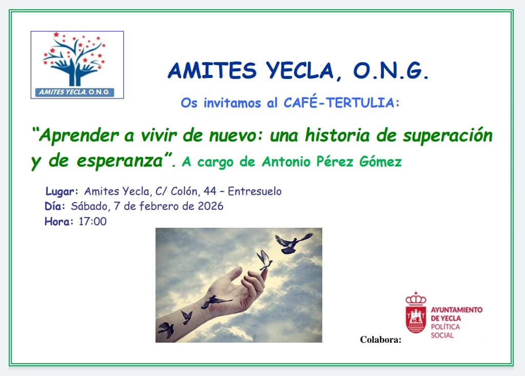 Café – tertulia: «Aprender a vivir de nuevo: una historia de superación y esperanza» Sábado 7 de febrero 17:00h – Calle Colón, 44 – AMITES AMITES + Añadir Google Calendar + exportación iCal / Outlook Fecha 07 Feb 2026 Hora 17:00 Localización Escuela de Música Calle España, 12 Categoría Actos Escuela de Música