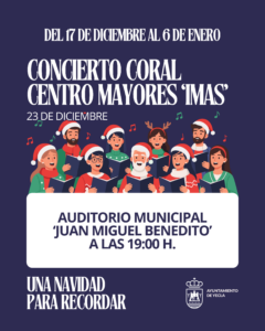 Concierto Coral Centro Mayores IMAS + Añadir Google Calendar + exportación iCal / Outlook Fecha 23 Dic 2025 Hora 19:00 Localización Auditorio Municipal "Juan Miguel Benedito" Plaza Mayor, s/n - 30510 Yecla (Murcia) Categoría Actos Ayuntamiento de Yecla
