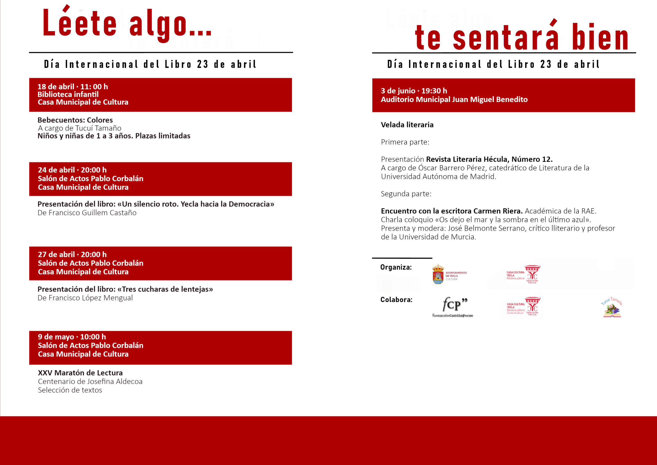 Día Internacional del Libro 2026 «Biblioteca Infantil» PROGRAMACIÓN 18 de abril – 11h – Biblioteca Infantil Casa Municipal de Cultura . AYUNTAMIENTO DE YECLA, CULTURA + Añadir Google Calendar + exportación iCal / Outlook Fecha 18 Abr 2026 Hora 11:00 Localización Casa Municipal de Cultura C/ España, 37. 30510 Yecla (Murcia) Categoría Actos Casa Municipal de Cultura